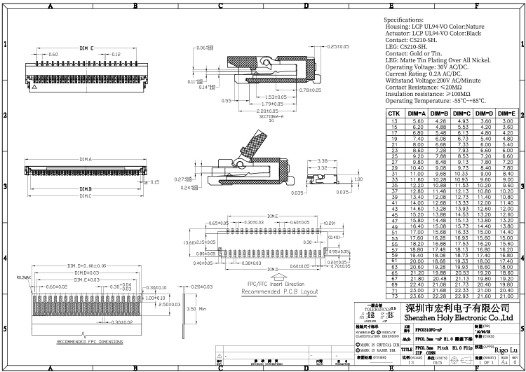 fpc连接器0.3mm间距H1.0厚翻盖下接 封装规格书图纸 型号尺寸图 在线下载
